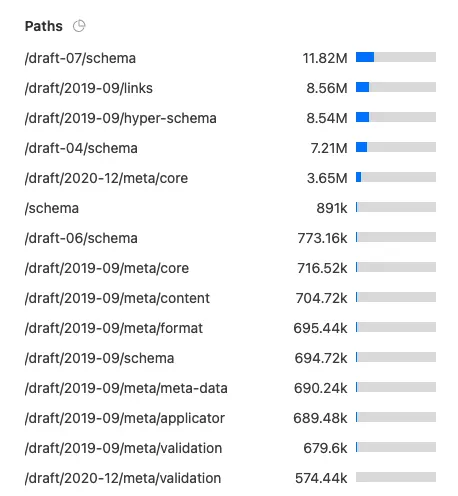 The JSON Schema website hosts the official meta-schemas. If you're not sure what that means, meta-schemas are JSON Schemas for JSON Schema. Why is this interesting? Well, we host all historical versions of the meta-schema, not just the most recent. And while we don't expect code to be making requests on a regular basis to download the meta-schemas, the number of requests strongly suggests that they do.